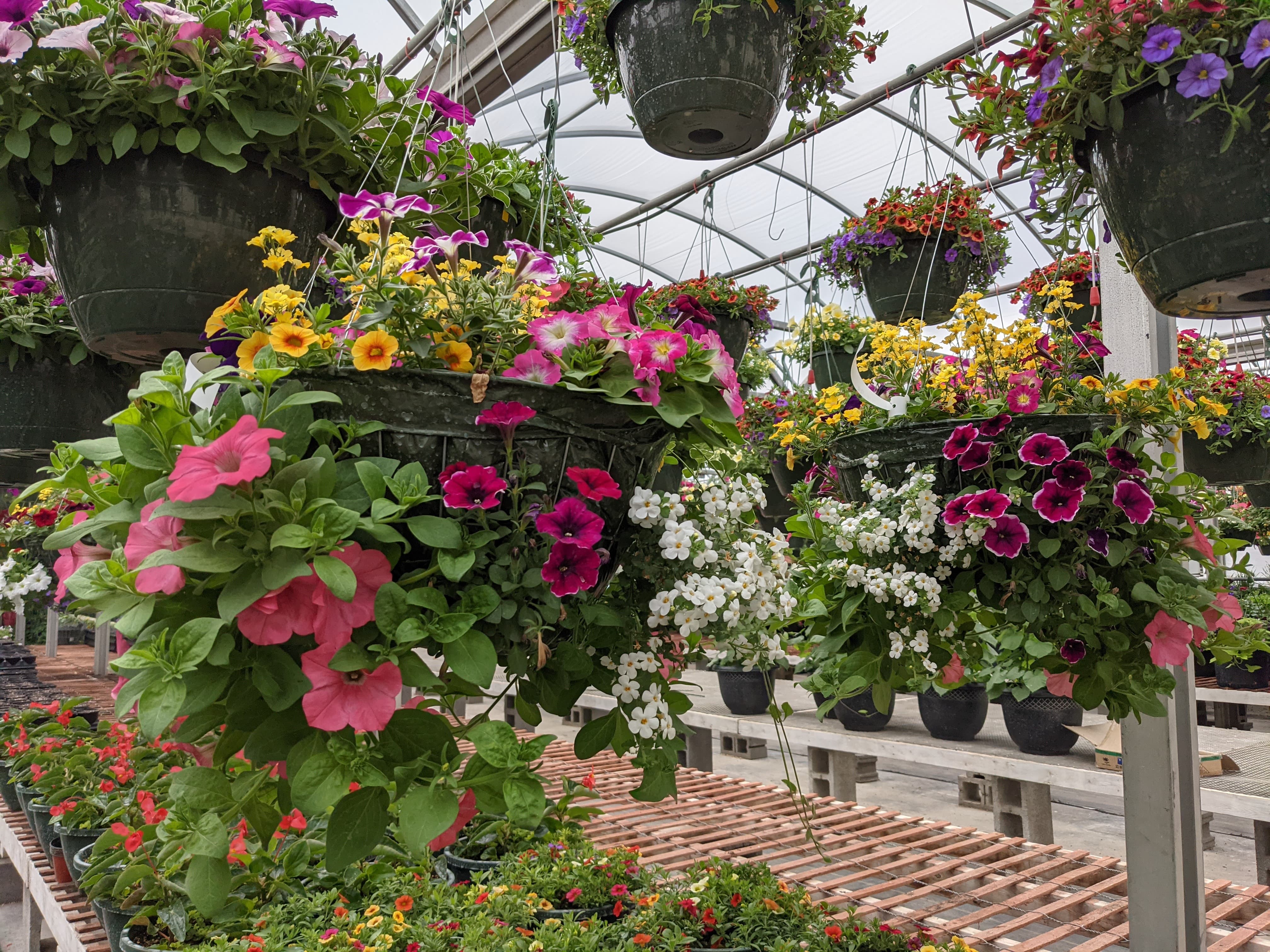 Extra large monster basket with deep purple petunias Large monster basket featuring pink and white flower mix Monster basket with red geraniums and small white flowers Vibrant full summer bloom in a monster hanging basket Monster hanging basket with trailing lavender and pink flowers Collection of monster baskets in our greenhouse Colorful multi-flower arrangement in a large monster basket